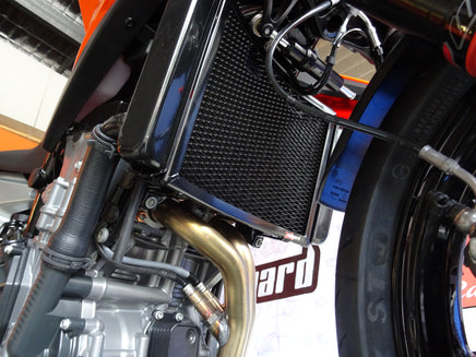 The rigid frame of the Rad Guard holds the expanded mesh in place so that hard hits by stones and any other road debris will save your core from certain damage. This rigid frame also acts as a brace to prevent the radiator core from being squashed if a side impact occurs. For example, the bike falls off the stand.